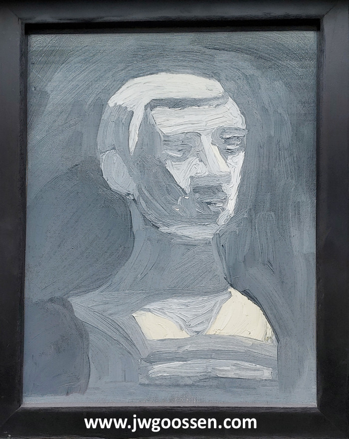 A greyish head bust style portrait painting.